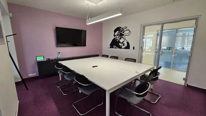 Kapacita až 10 osob, výměra 18 m2, stůl 200x260 cm, LED monitor s úhlopříčkou 165cm, věšák, magnetická bílá popisovací tabule 100 x 150 cm, flipchart (na přání), wifi, klimatizace.