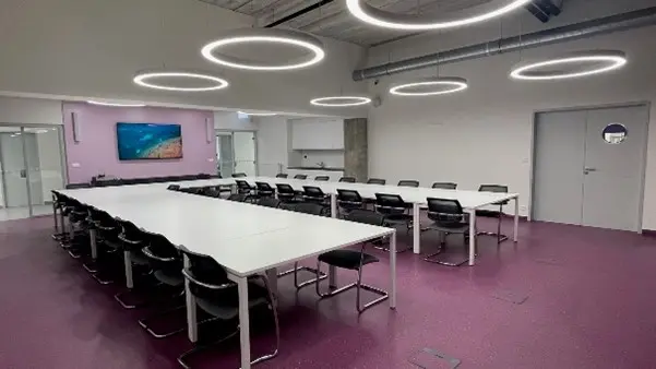 Kapacita až 50 osob, výměra 94 m2, stoly 80 x 160 cm s libovolné sestavě, případně vyklizené a křesla v divadelním uspořádání, LED monitor s úhlopříčkou 190cm, promítací plátno s úhlopříčkou 300 cm, projektor, audiosystém, flipchart, kuchyňský kout, věšák, wifi, klimatizace.